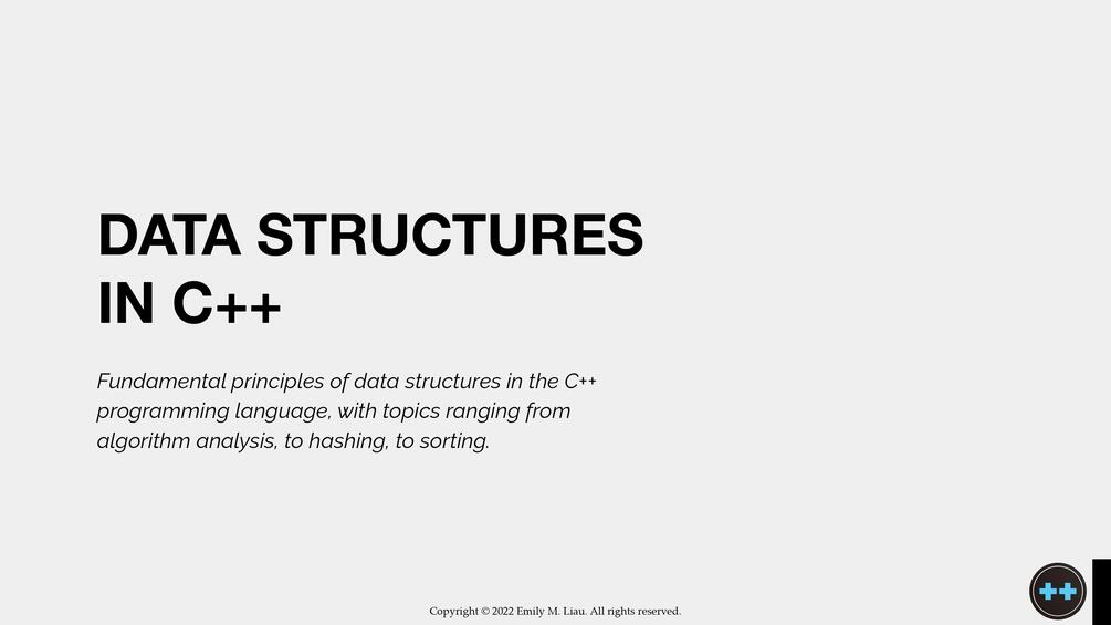 Fundamental principles of data structures in the C++ programming language, with topics ranging from algorithm analysis, to hashing, to sorting.